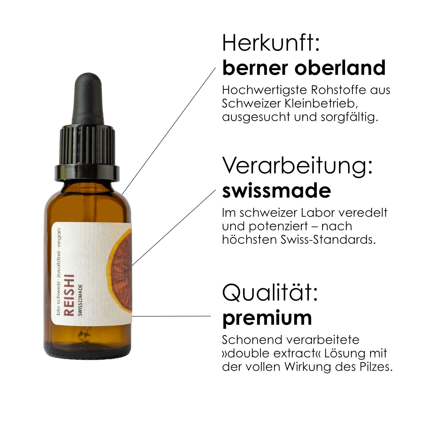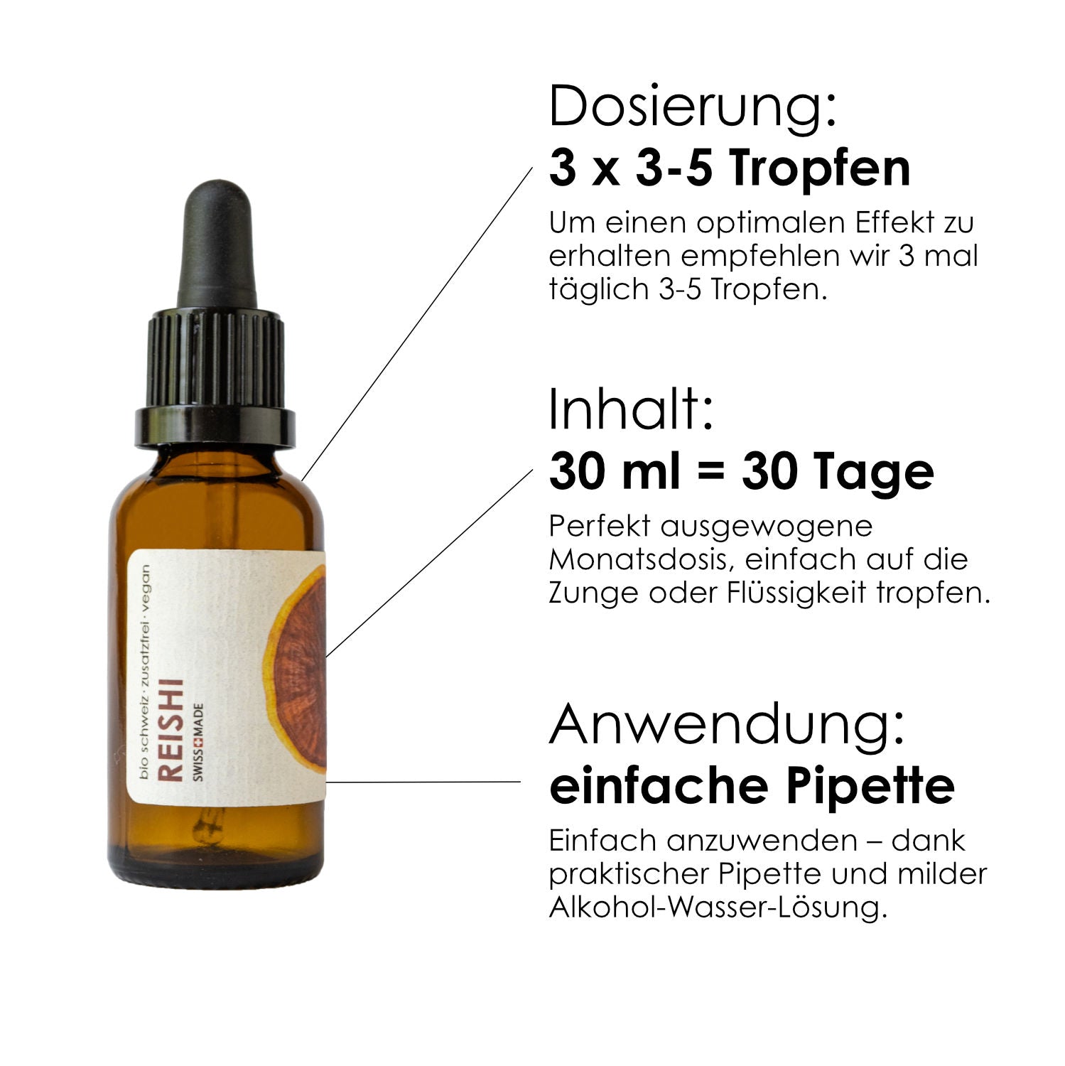 Reishi – auch als "Pilz der Ruhe" bekannt – wird in der Schweiz und in Bio-Qualität kultiviert. Durch ein spezielles doppeltes Extraktionsverfahren entsteht eine kraftvolle Flüssig-Tinktur, die dein tägliches Ritual auf natürliche Weise bereichert.